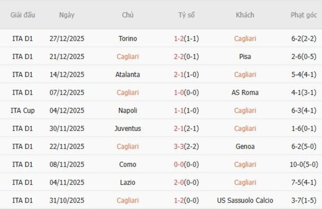 Phong độ của Cagliari