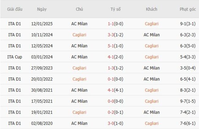 Thành tích đối đầu quá khứ giữa Cagliari vs AC Milan