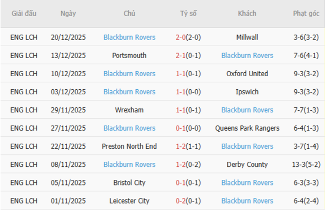Phong độ của Blackburn Rovers