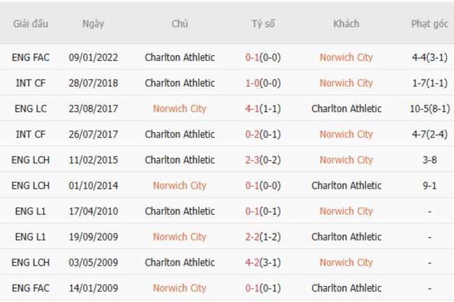 Thành tích đối đầu quá khứ giữa Norwich City vs Charlton